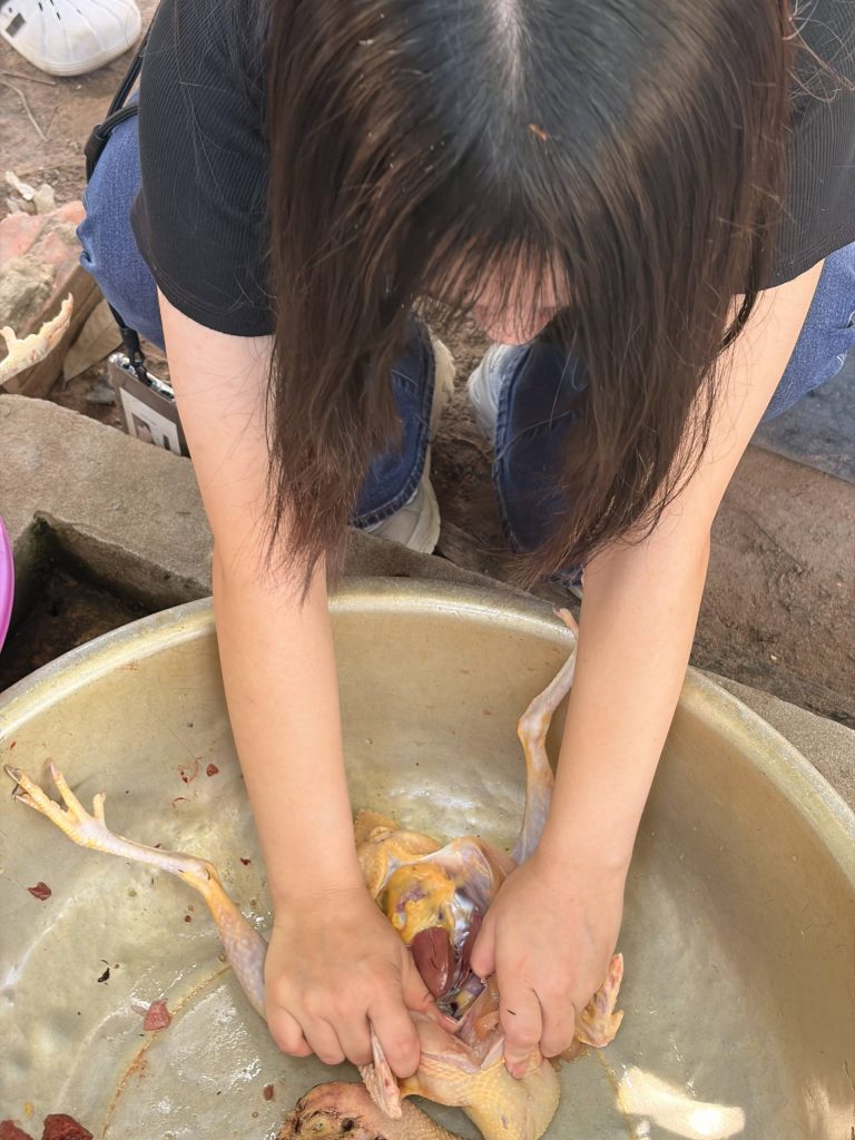 また現地の村人のお家を訪問して、一緒に地鶏を絞めて捌いて料理したり、